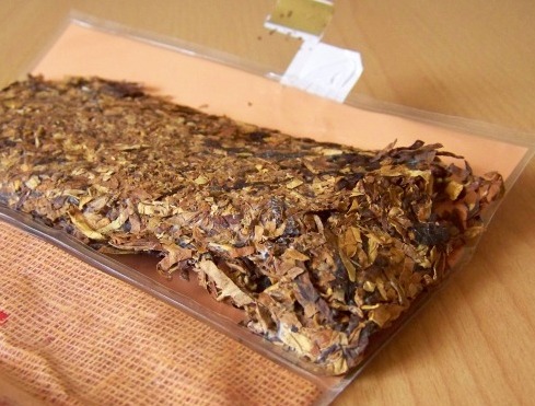 Akkor ott a szeme előtt felbontottam az érintetlen zárjegyes csomagot és mindketten belekukkantottunk és beleszagoltunk: a dohányon penész-szerű bevonat volt, ami a dohányzacskó belső falán is nyomokat hagyott.